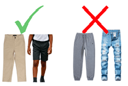 **NO athletic pants or shorts, yoga pants, biker shorts, leggings, or pajama-type pants are permitted. |