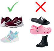 SHOES Tennis shoes/gym shoes only. **NO flip-flops, slides, house shoes, sandals, Crocs, boots, booties, or open-toed shoes of any kind. |